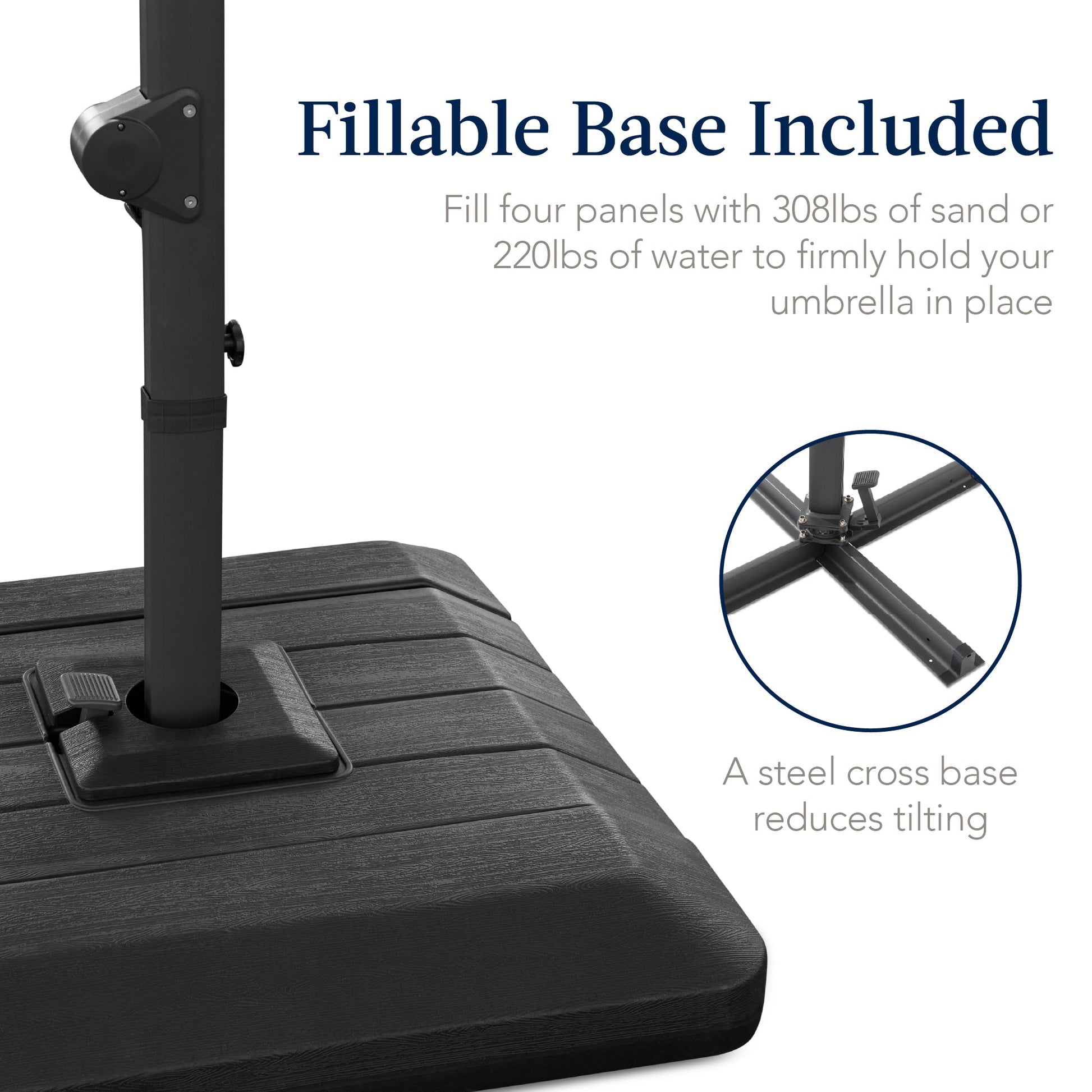 • FILLABLE BASE: Enjoy instant shade with an included, four-piece fillable base, adding your choice of sand (308 lbs.) or water (220 lbs.) for a rock-solid, wind-resistant setup