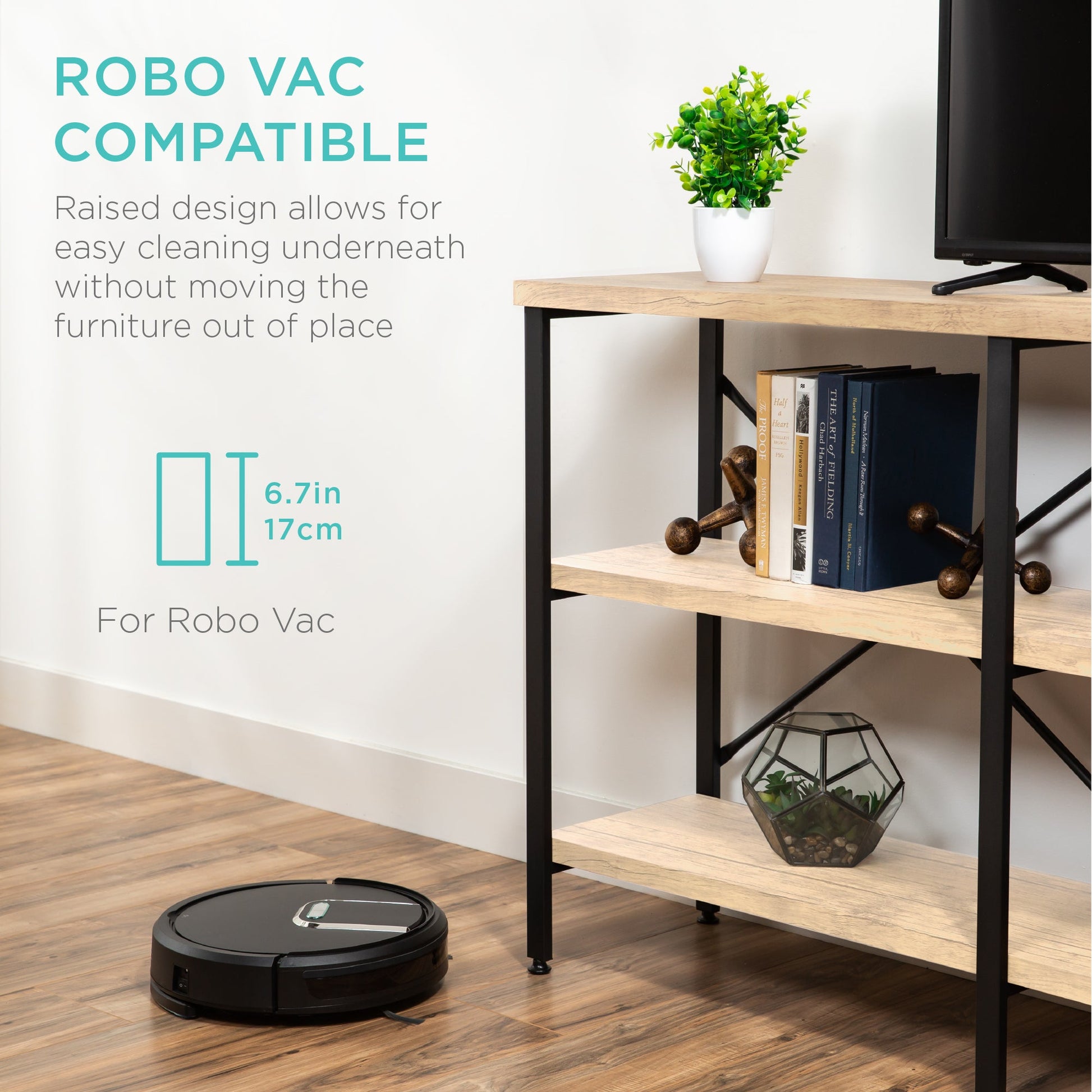 • RAISED SHELF: This console piece provides 3-tiers of storage space with a raised bottom shelf to allow for robovac compatibility and hassle-free vacuuming underneath