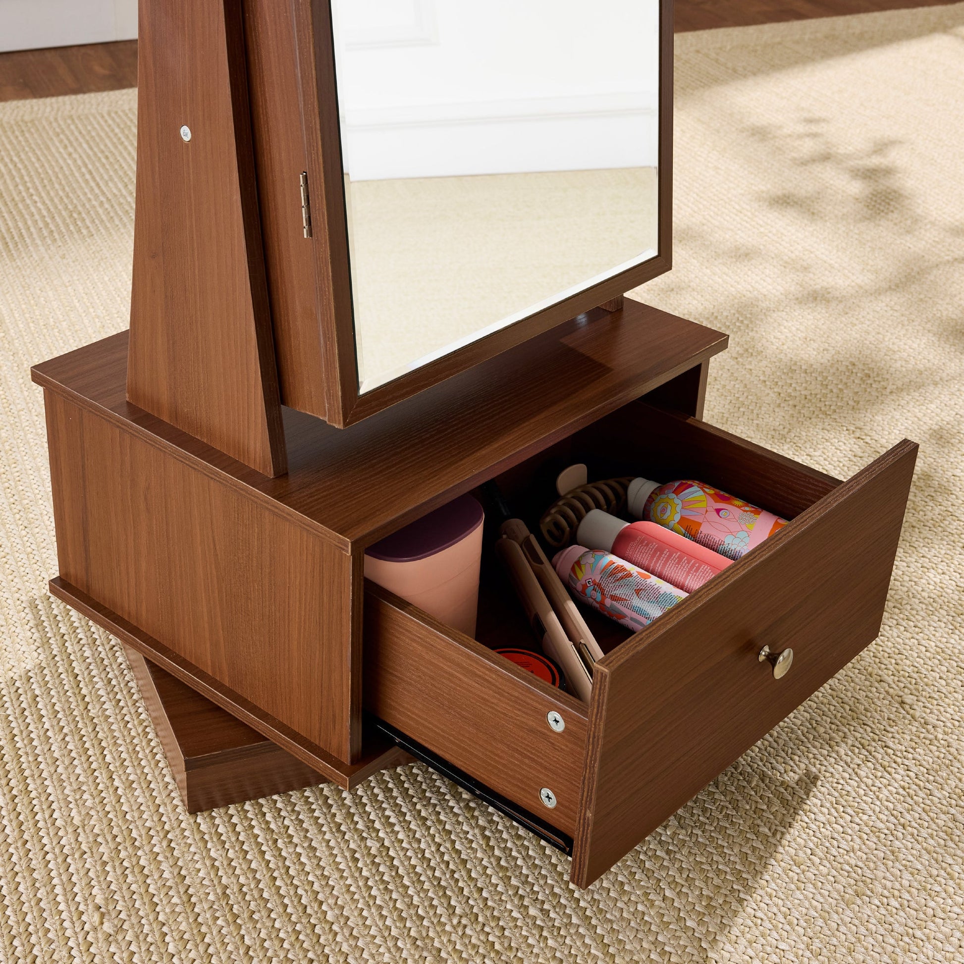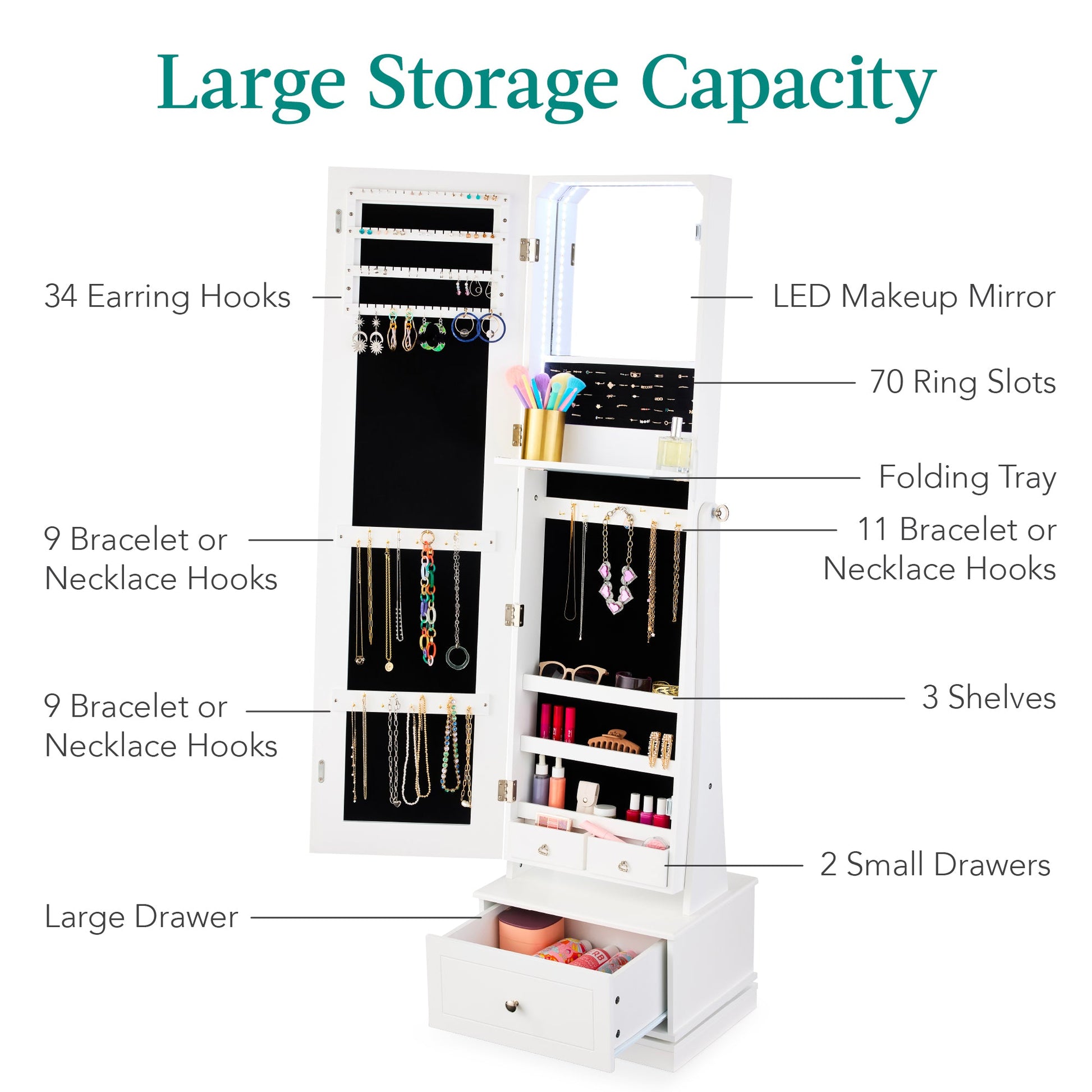 • AMPLE STORAGE: Includes 29 hooks for bracelets and necklaces, 34 earring rests, 70 ring slots, three lined shelves for cosmetics, a foldable makeup shelf, two pull-out cubbies, and a large base drawer for cosmetics and accessories