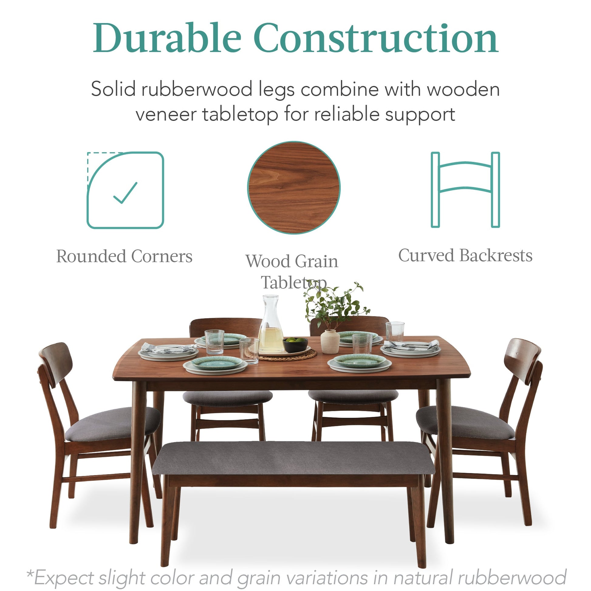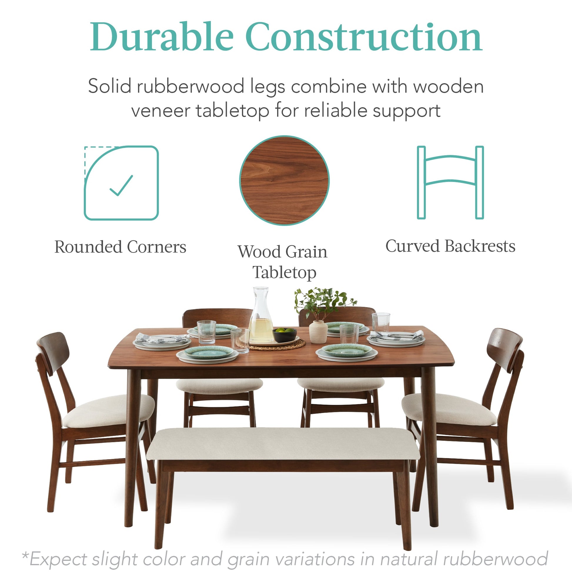 6-Piece Mid-Century Modern Upholstered Wooden Dining Set w/ 4 Chairs, Bench