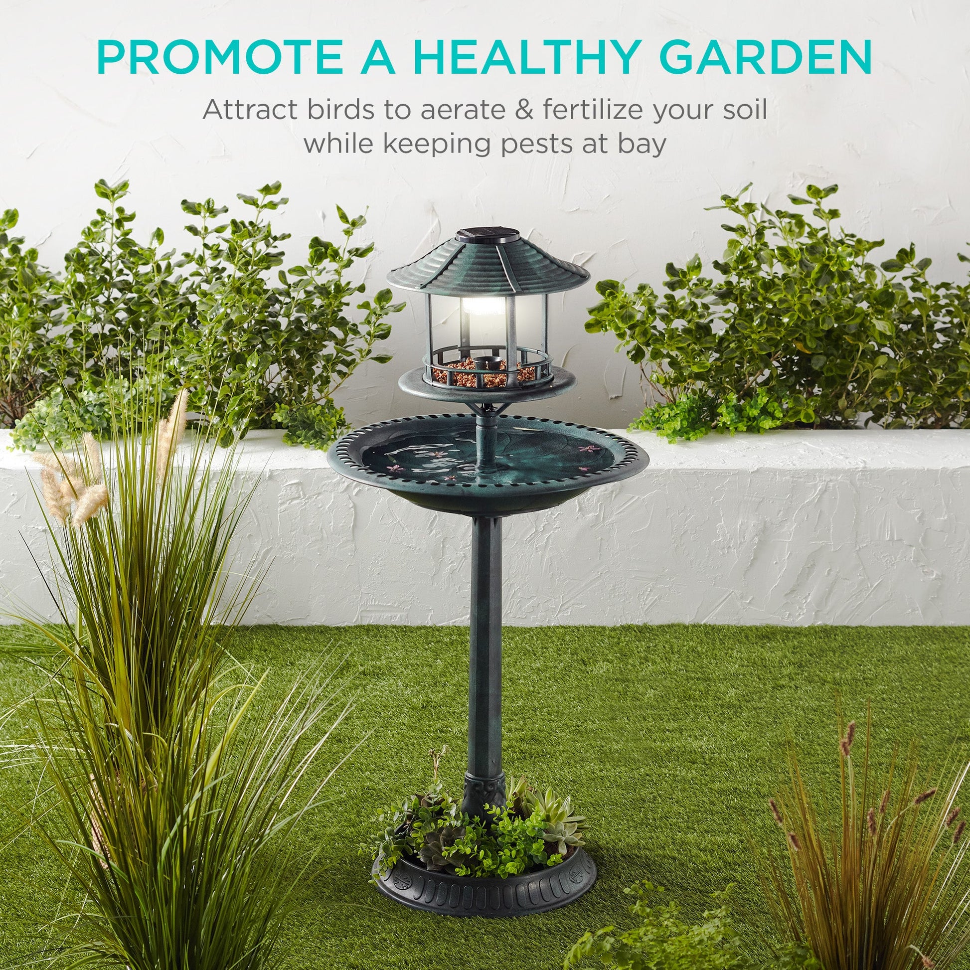 Solar Lighted Outdoor Pedestal Bird Bath w/ Planter, Decorative Bird Cage