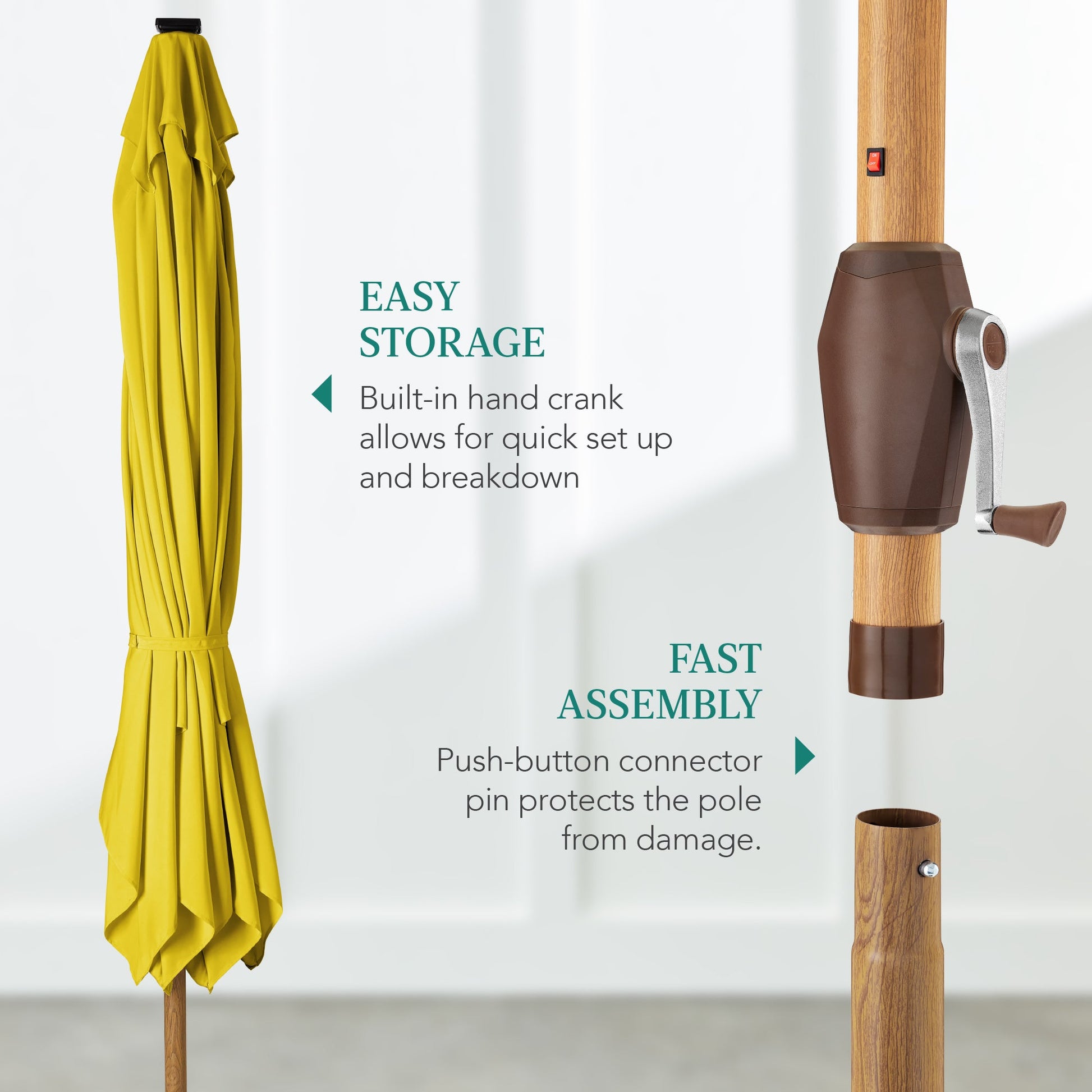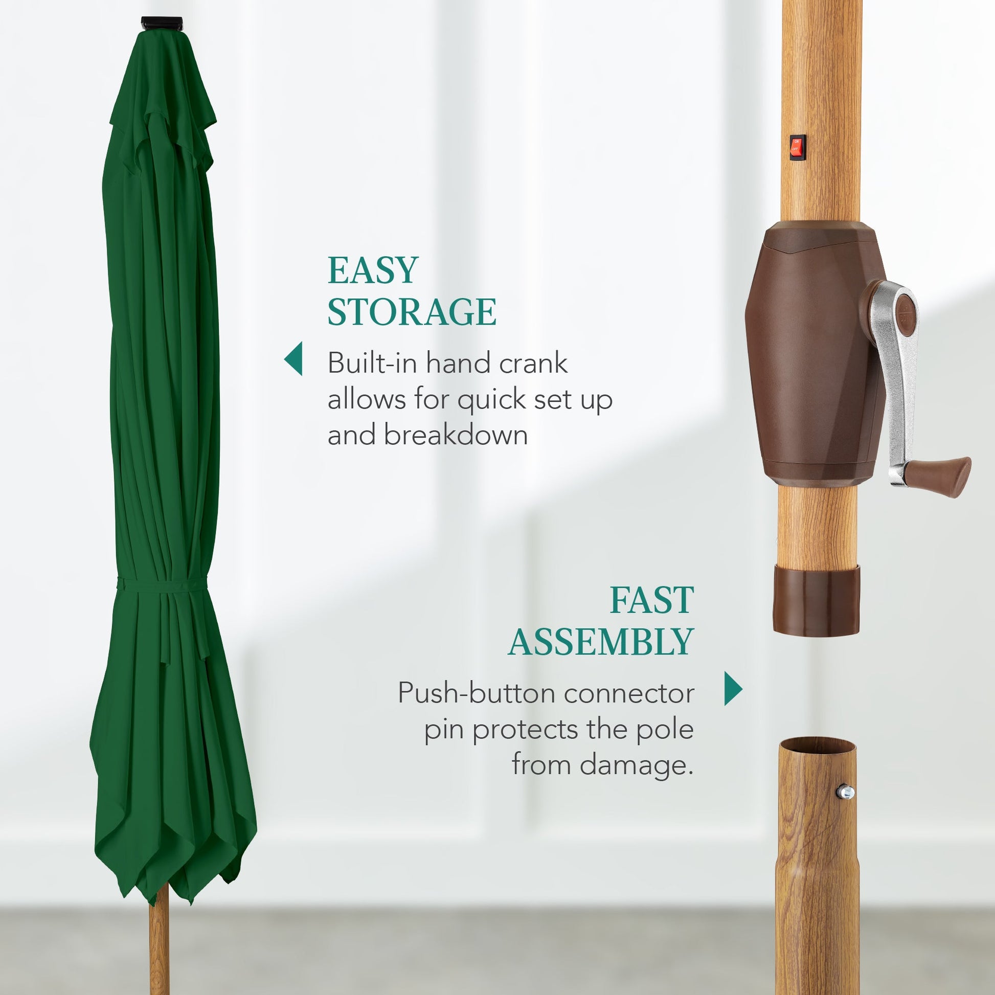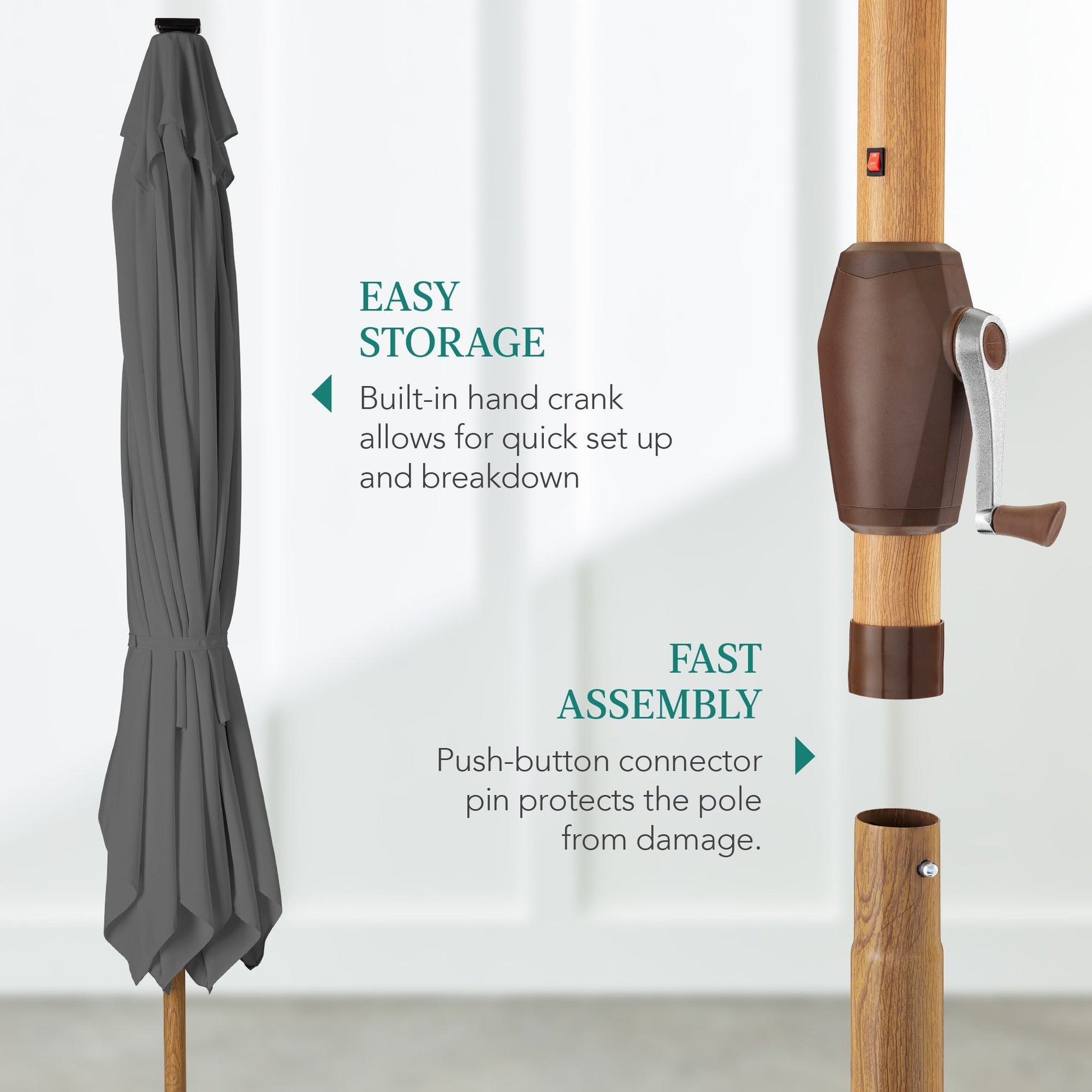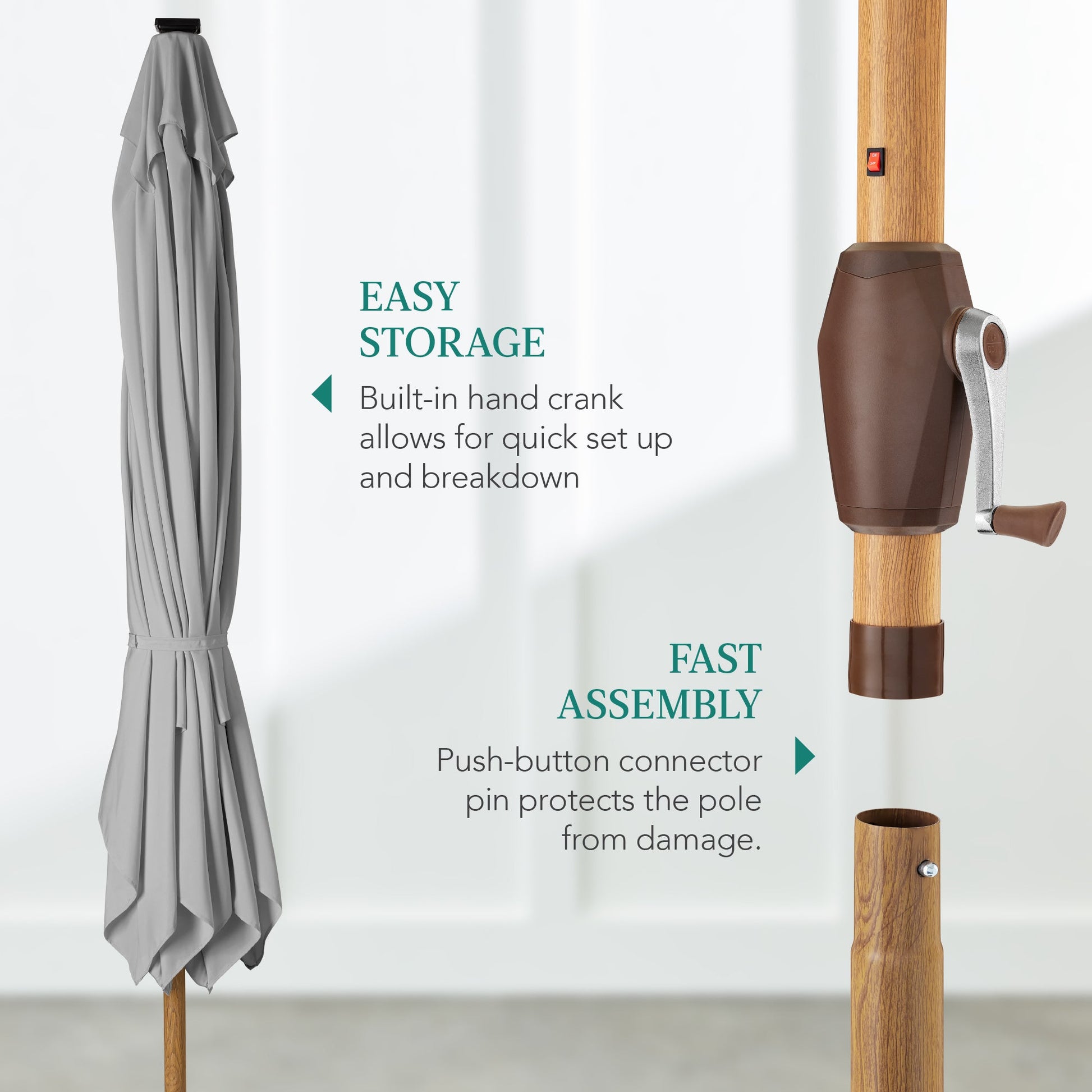 • CONVENIENT CRANK HANDLE: A simple internal pully allows you to easily open and close this umbrella for quick and easy setup or storage