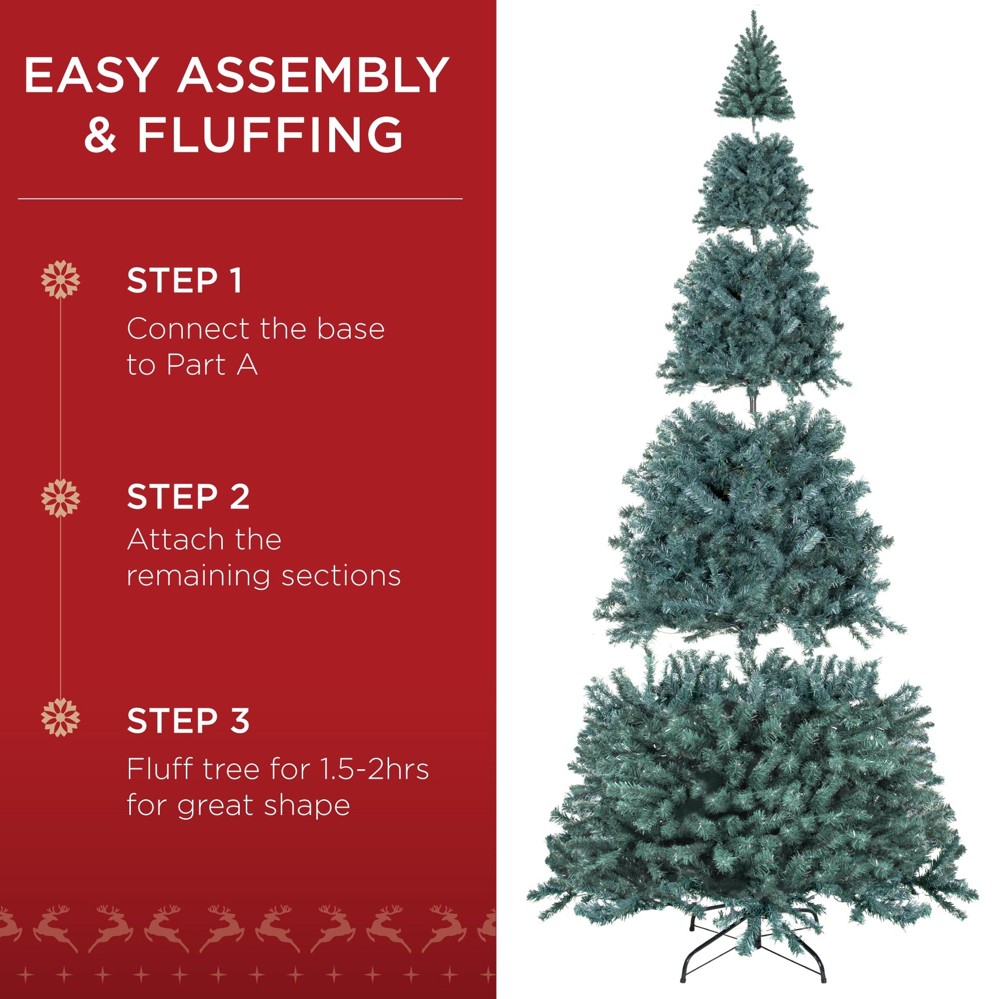 • EASY ASSEMBLY & FLUFFING: Put the tree together in just three steps: simply unfold the metal stand and stack each section from largest to smallest, then fluff and enjoy!